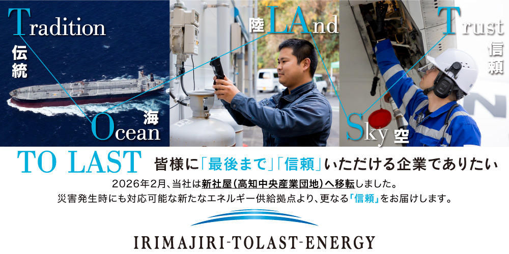 入交グループ操業より受け継がれる「伝統:Tradition」を胸に、高知県下で唯一「海:Ocean」「陸:Land」「空:Sky」全てにエネルギー供給が可能な企業として、皆様により一層「信頼:Trust」していただけるよう、「最後まで:TO LAST」エネルギーを供給し続ける会社でありたいという願いを社名に込めました。