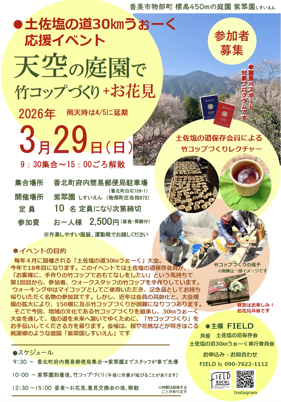 | 当日の流れ | 9:00 府内簡易郵便局集合・作業内容の説明 (高知県香美市香北町白石729-1) 9:30 「竹コップづくり」開始 12:00 昼食・休憩 14:00 「竹コップづくり」終了・「お花見交流会」開始 15:00 終了・解散 |