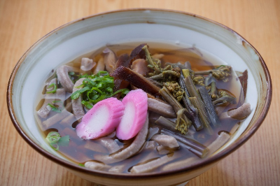 「立川そば」は、地元の人にとって懐かしい家族の味です。特に大晦日の夜は、食卓に家族皆がそろって食べました。つなぎを使わない極太の麺で、強いそばの風味ともっちりした麺の噛み応えが自慢。山菜やイノシシ肉をのせていただきます。そばの香りとだし汁のうまみが口の中に広がって、食べると体がポカポカします。