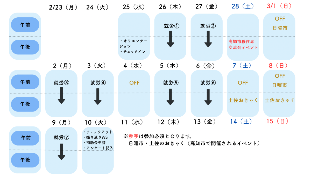 【全体スケジュール】※高知ファイティングドッグスの就労日は、実施期間中のイベントや試合日程により別スケジュールになる予定です。