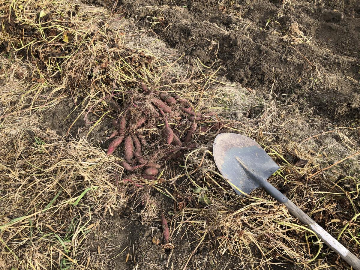 ツルを取り終えたあとは、機械でサツマイモを掘りやすくして、いよいよ手作業でサツマイモ掘り。