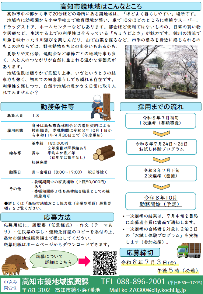 身分は高知市森林組合との雇用契約による技術職員となります。高知市は地域おこし協力隊(企業型隊員)を委嘱することとし、委嘱期間は令和8年10月1日(委嘱開始日は、採用決定後に相談可)から最長で令和11年9月30日(年度更新で最長3年間)までの予定です。