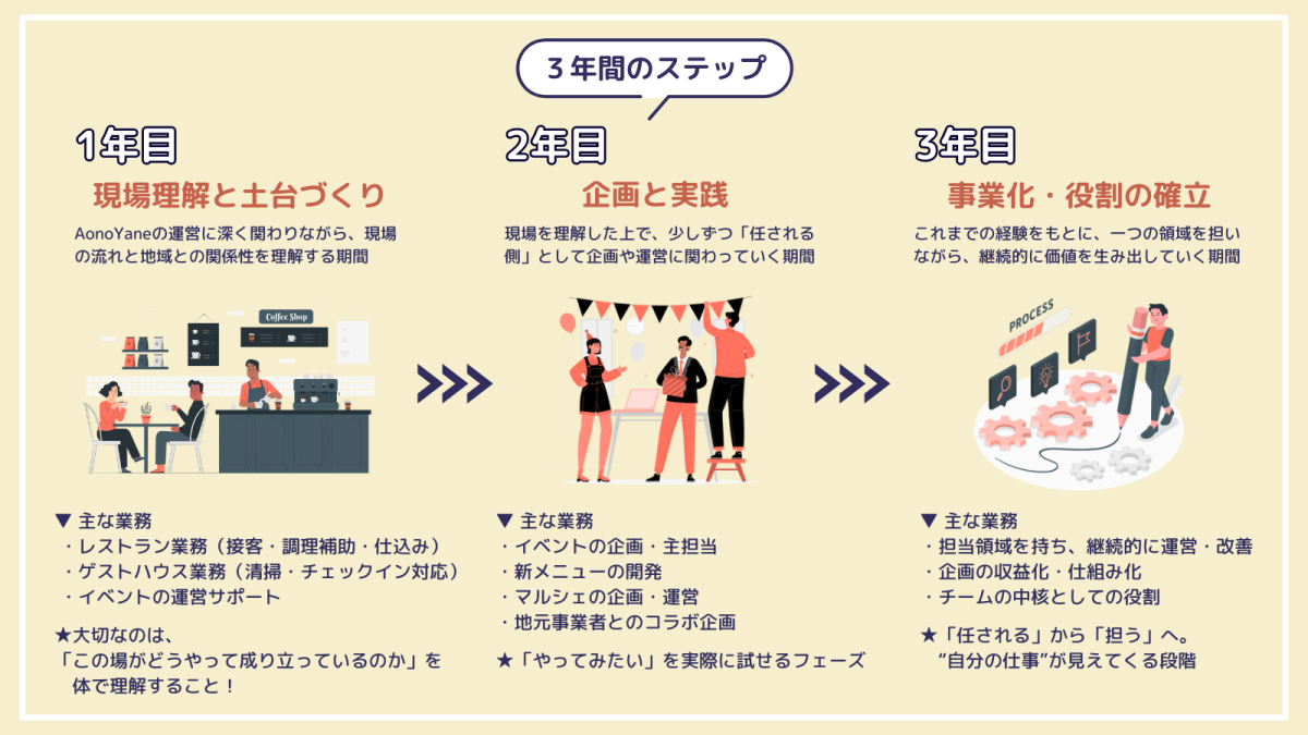 最初は、飲食店・ゲストハウスの現場からスタートします。