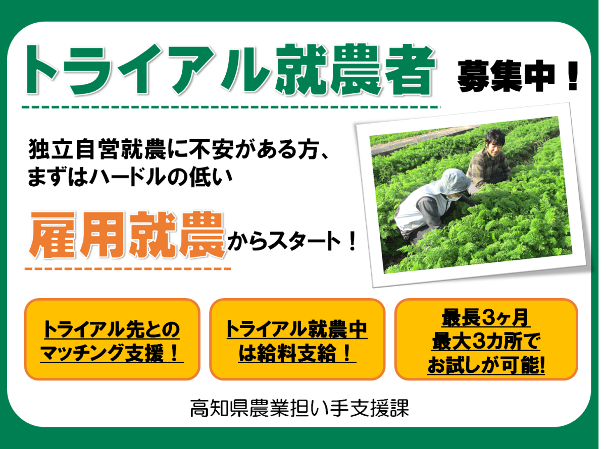 農業が未経験で不安がある、自分に農業が合っているかわからない方向けにお試しで就農する「トラ…
